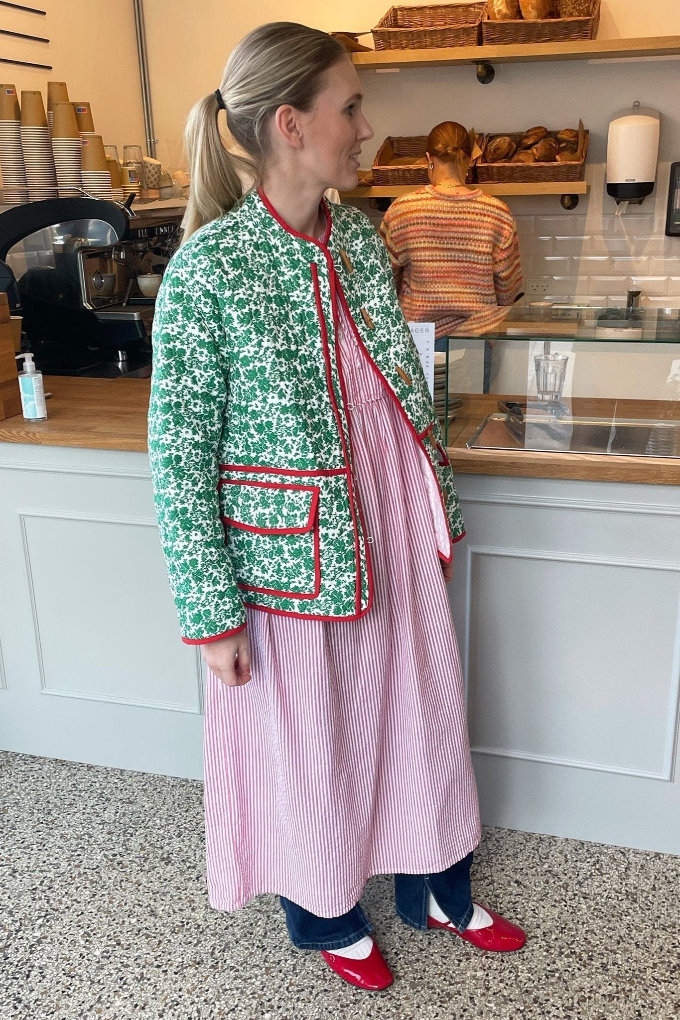 Bu kolsuz çiçekli patchwork pamuklu ceket, gardırobunuza tatlı ve taze bir hava katıyor. Büyüleyici çiçek tasarımı eğlenceli bir dokunuş katarken, düğme ayrıntıları genel çekiciliğini artırıyor.