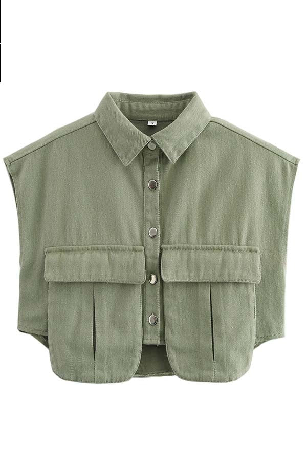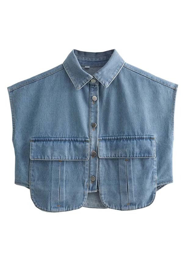 Amora™ Denim Button Up Cape Sleeve Pocket Crop Top