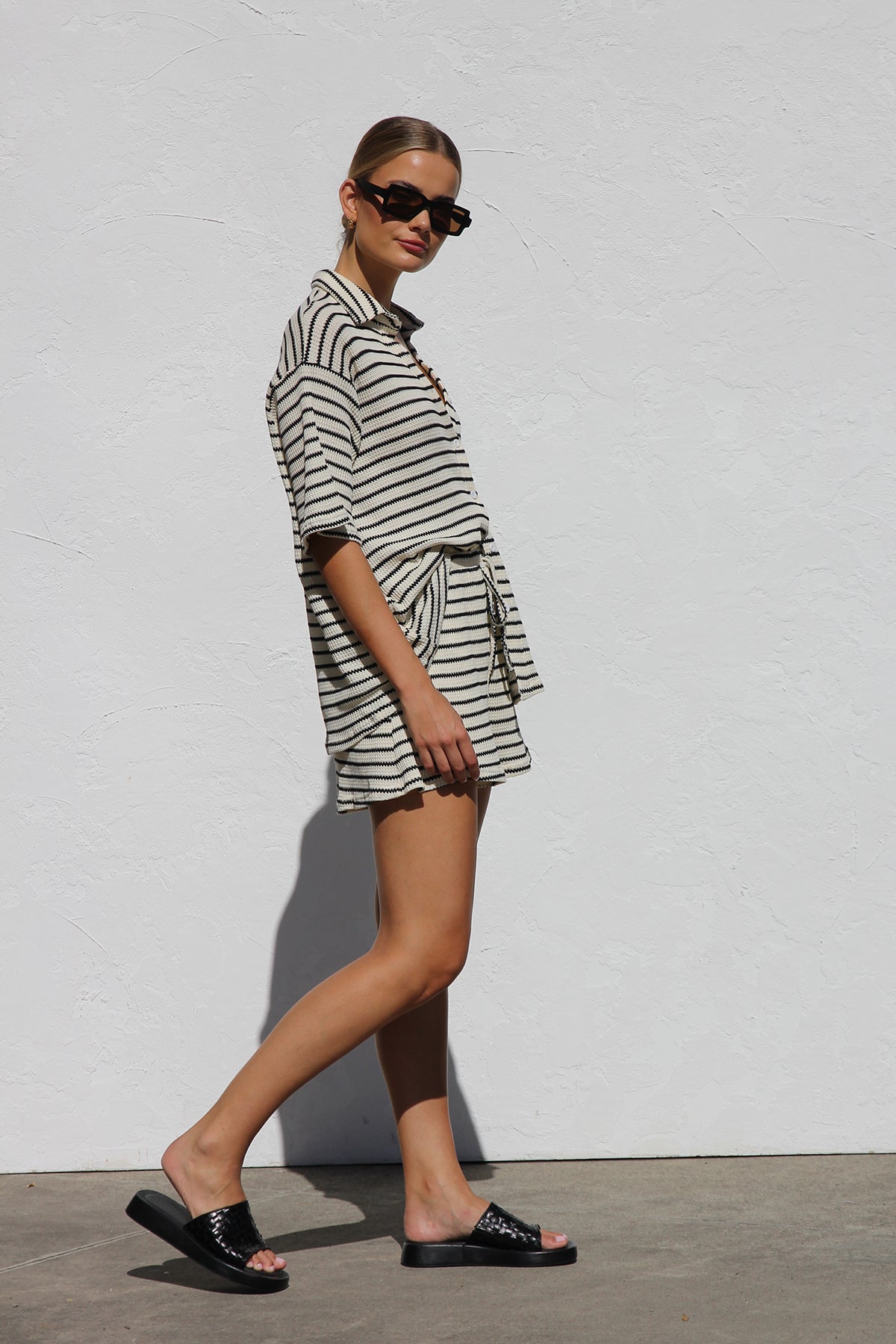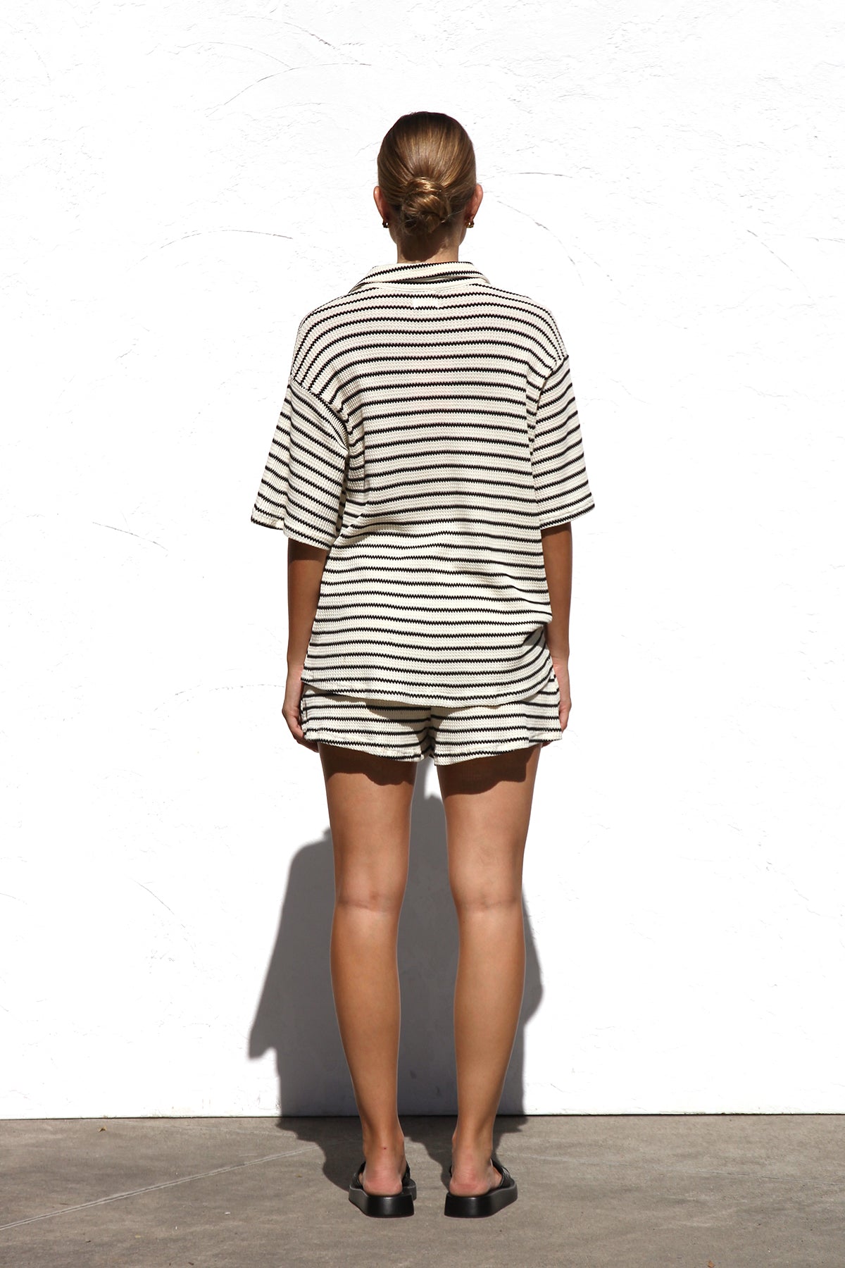 Çarpıcı siyah çizgili baskıya sahip bej tabanlı bu hafif iki parçalı örgü setle zahmetsiz tarzı keşfedin. Set, havadar ve gündelik bir görünüm için astarsız ve yarı şeffaf, rahat kesim, yakalı, düğmeli bir üst içerir.