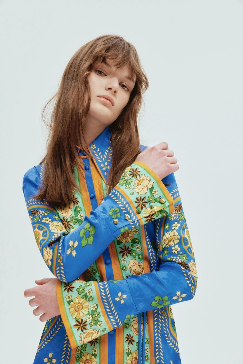 Tatile hazır bu uzun kollu elbise, şık bir yakaya ve belden bağlamaya sahiptir ve figürünüzü güzel bir şekilde vurgular. Göz alıcı konumlandırılmış baskı, canlı bir dokunuş katarak onu güneşli kaçamaklar veya gündelik geziler için mükemmel kılar.